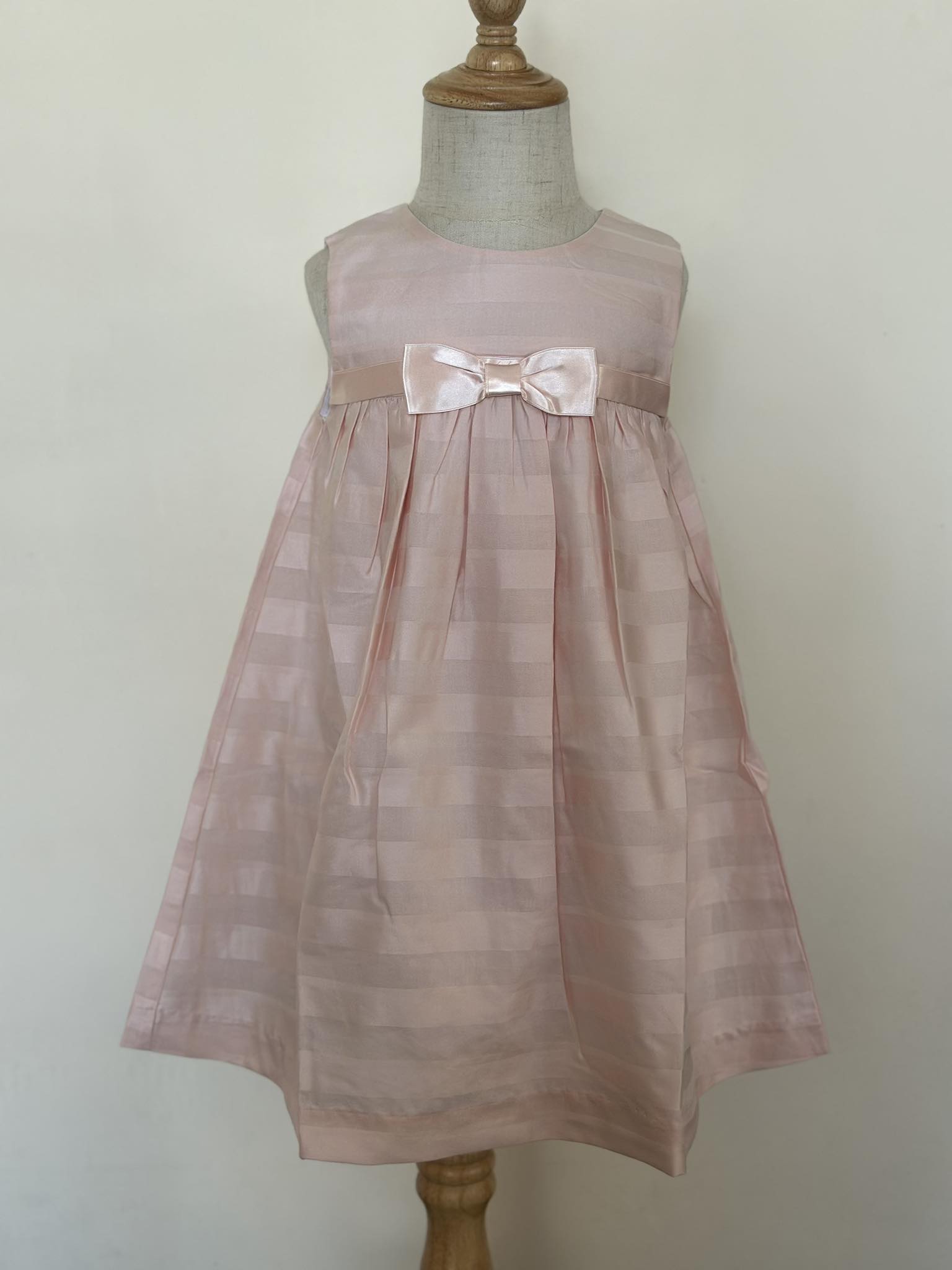 A delicate satin bow at the waistline adds a sweet focal point while enhancing the dress’s elegant silhouette. The subtle textured stripe fabric gives the dress a refined appearance without overwhelming its simple design.