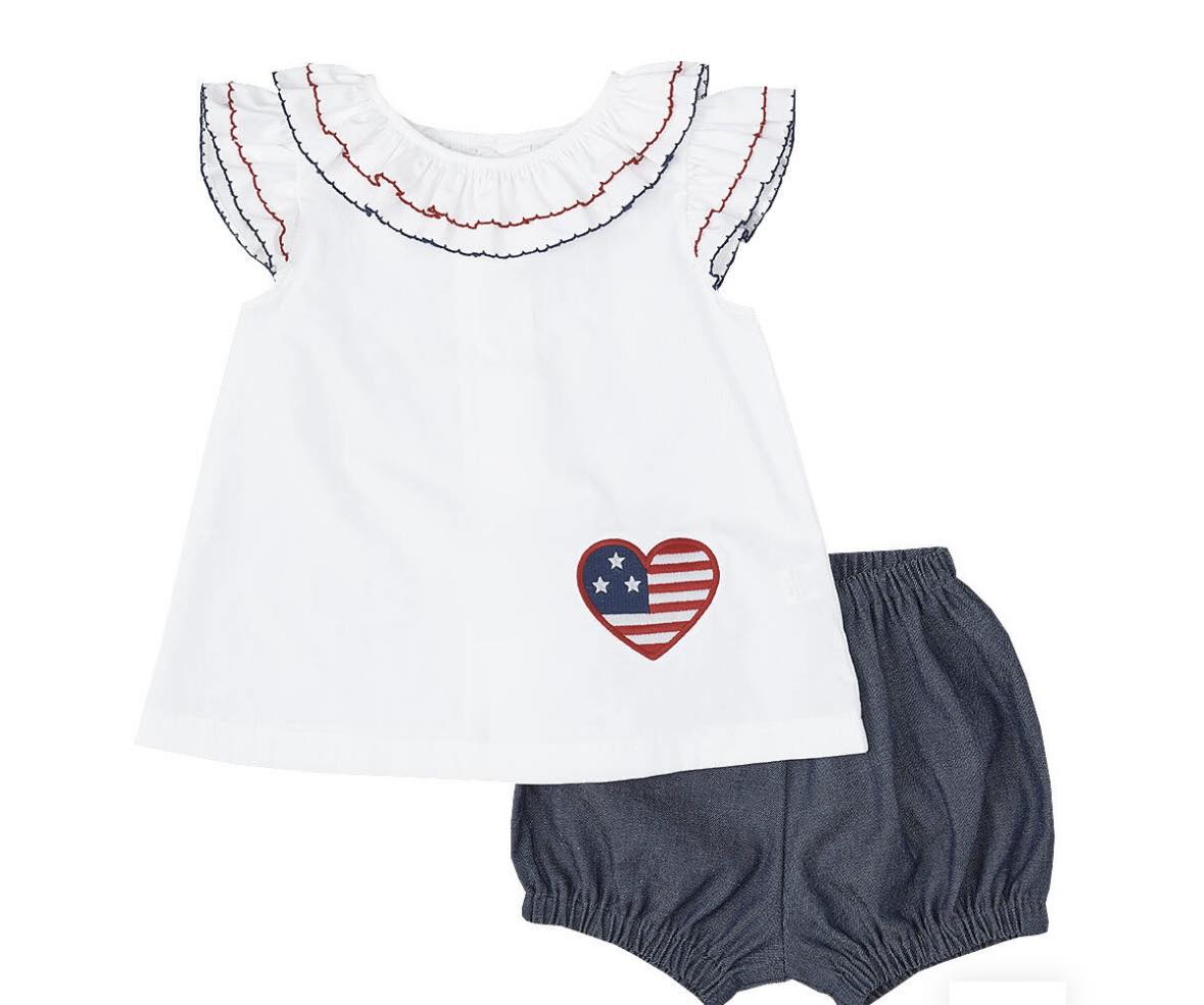 A patriotic heart embroidery showcasing the American flag adds a fun and celebratory touch. Paired with comfortable navy blue shorts with an elastic waistband, this outfit allows little ones to move freely while staying stylish and comfortable.