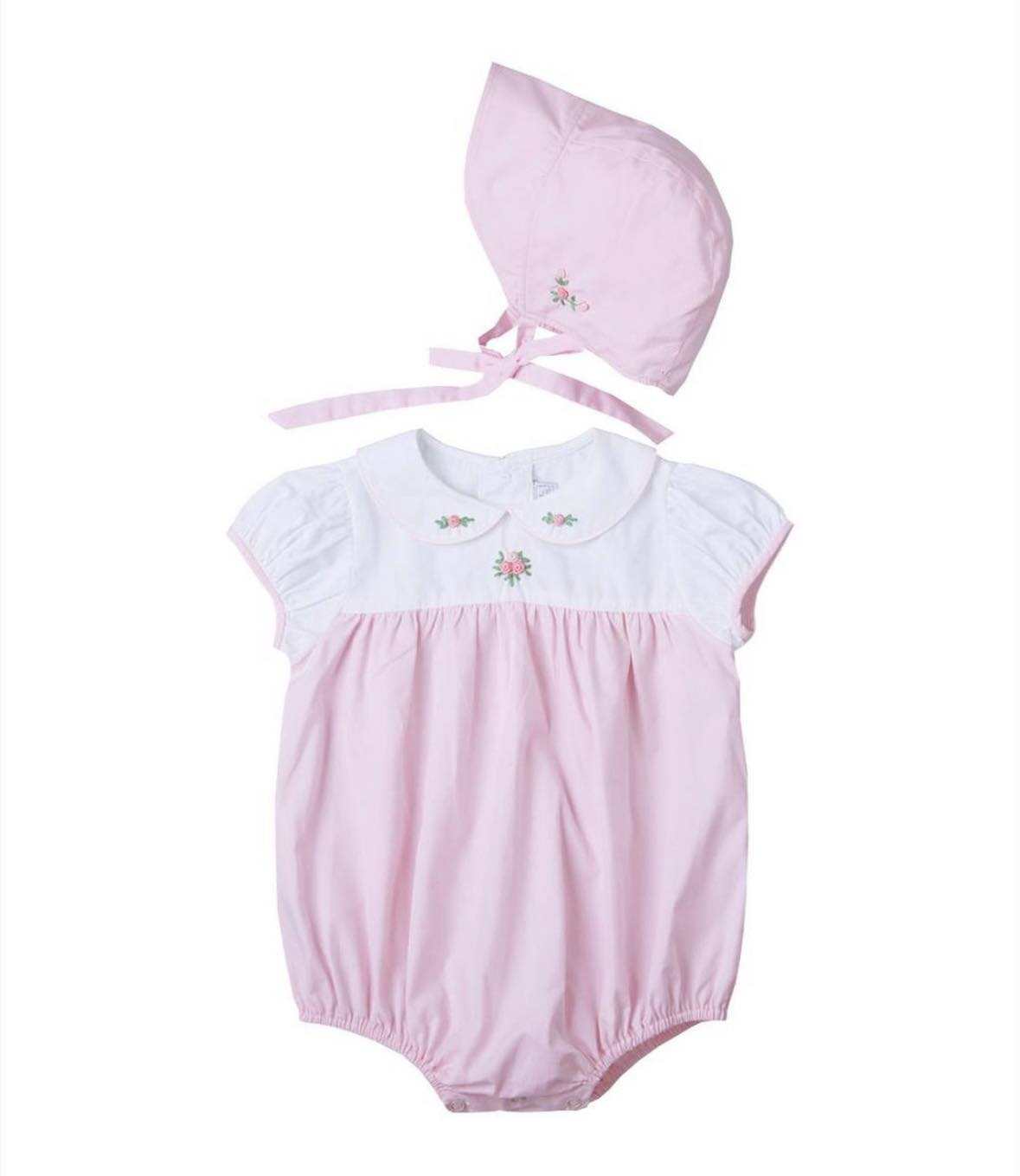 Pink Embroidered Bubble & Hat (FB-TM 122) is an elegant boutique-style set designed for little ones who deserve both charm and comfort. This two-piece outfit features a soft pink bubble romper with delicate floral embroidery on the chest and collar for a refined, classic look.