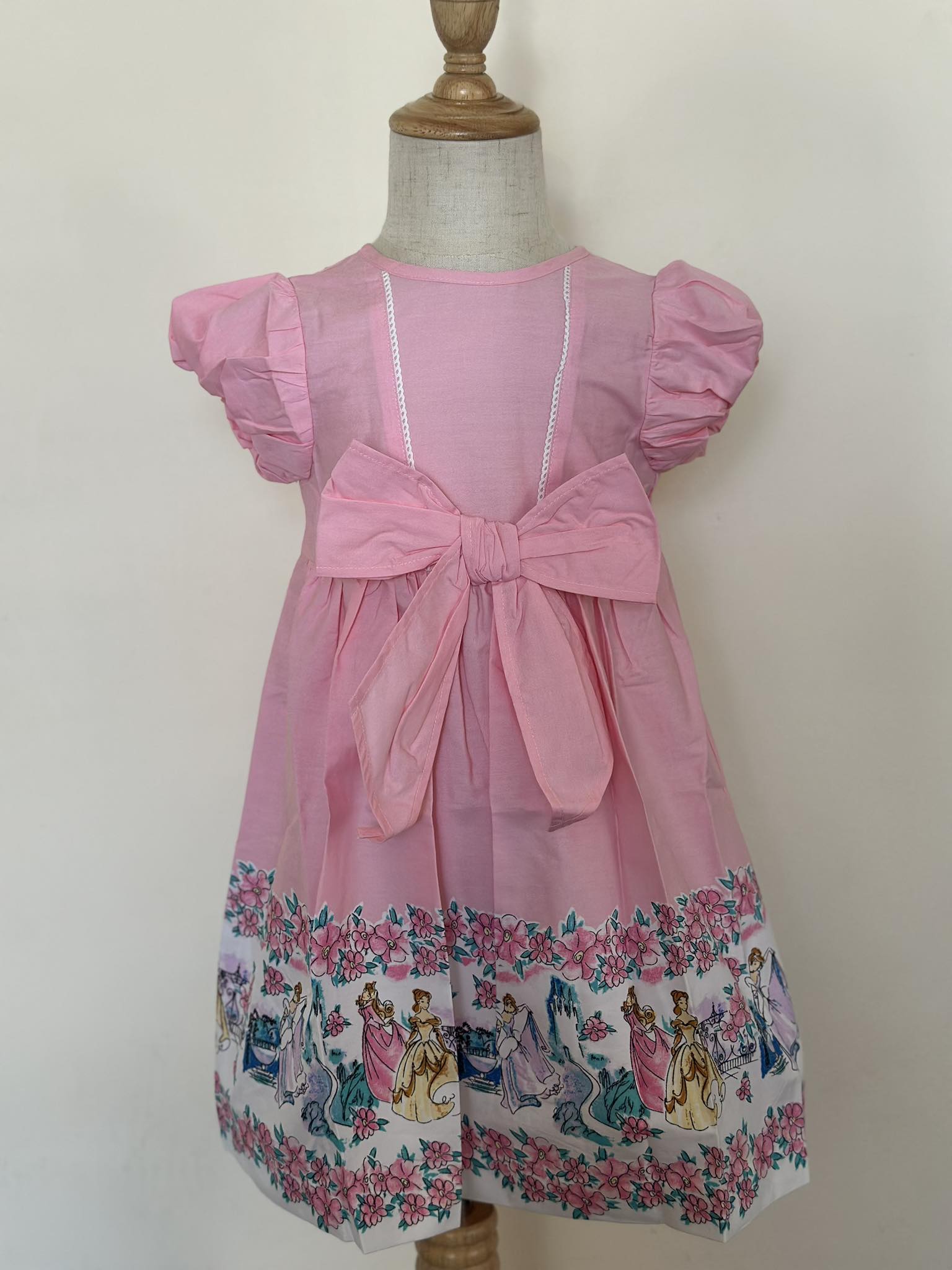 The back showcases a large statement bow that adds a classic boutique touch while creating a stunning look from every angle. Along the hem, a whimsical princess and floral print adds storybook charm, making the dress especially magical for little girls who love fairy tales.