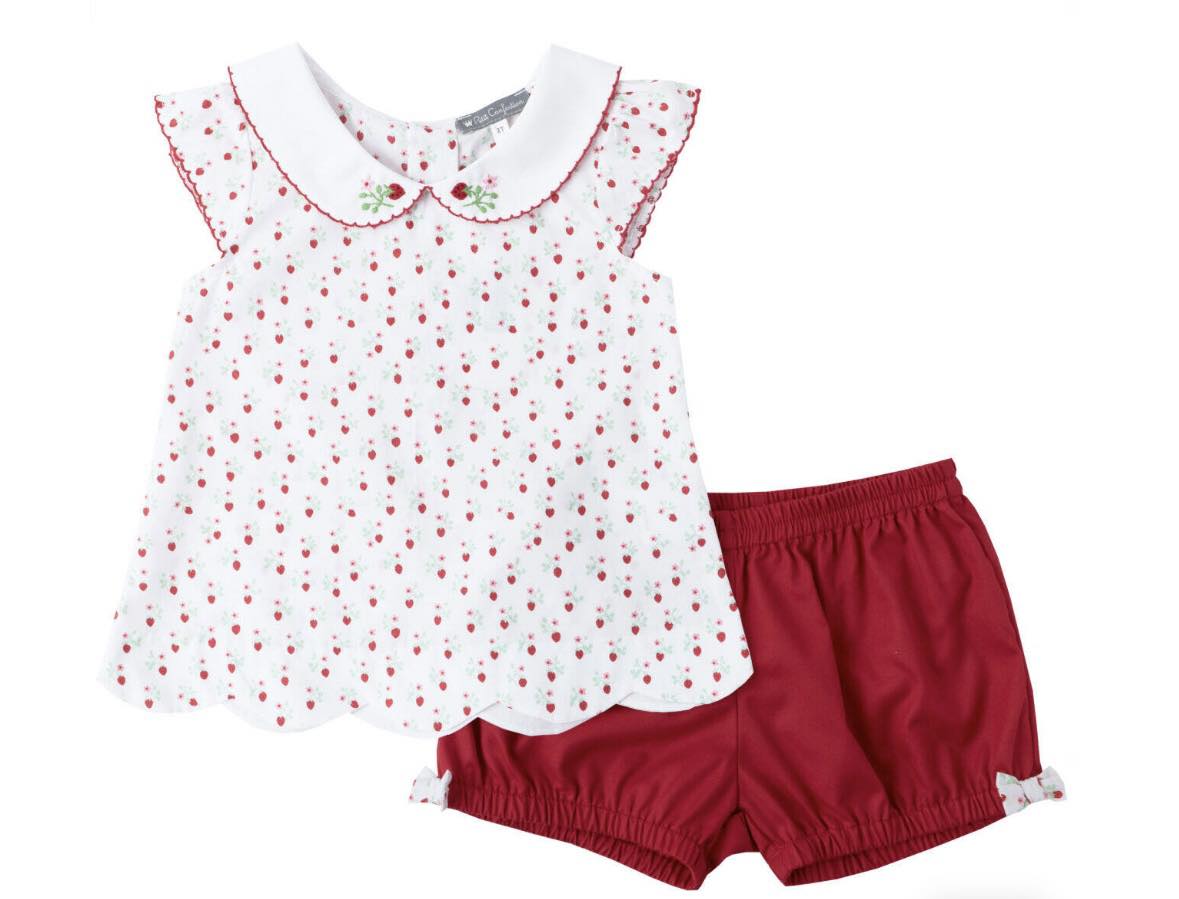 Adorable red and white strawberry embroidered tunic dress with matching bloomers. A sweet and playful summer outfit perfect for everyday wear and special moments.