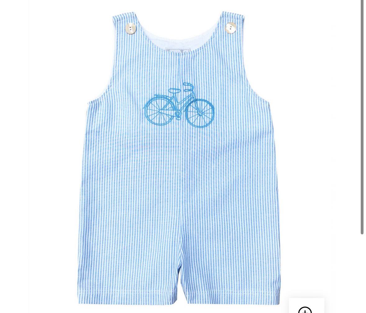 Classic blue seersucker shortall featuring an embroidered bicycle detail and button shoulder closure — lightweight, breathable, and perfect for spring and summer outings.