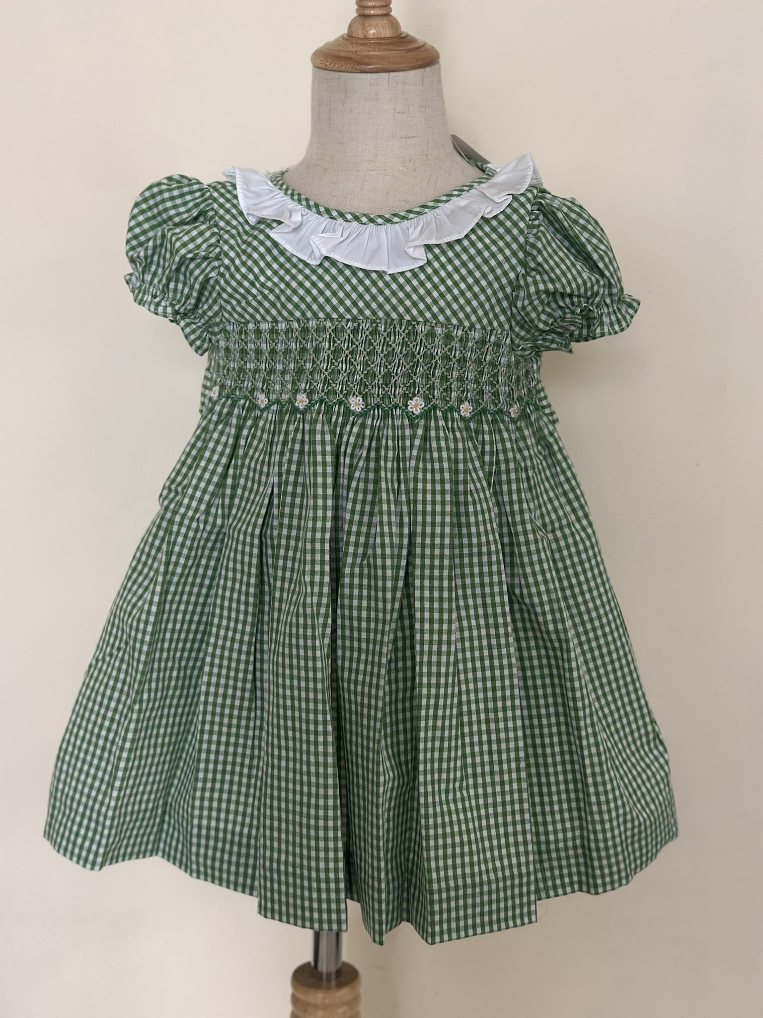 Featuring a fresh green and white gingham pattern, this dress showcases a beautifully hand-smocked bodice with delicate embroidered daisy accents. The soft white ruffle neckline adds a charming contrast, while puff sleeves enhance the classic silhouette.