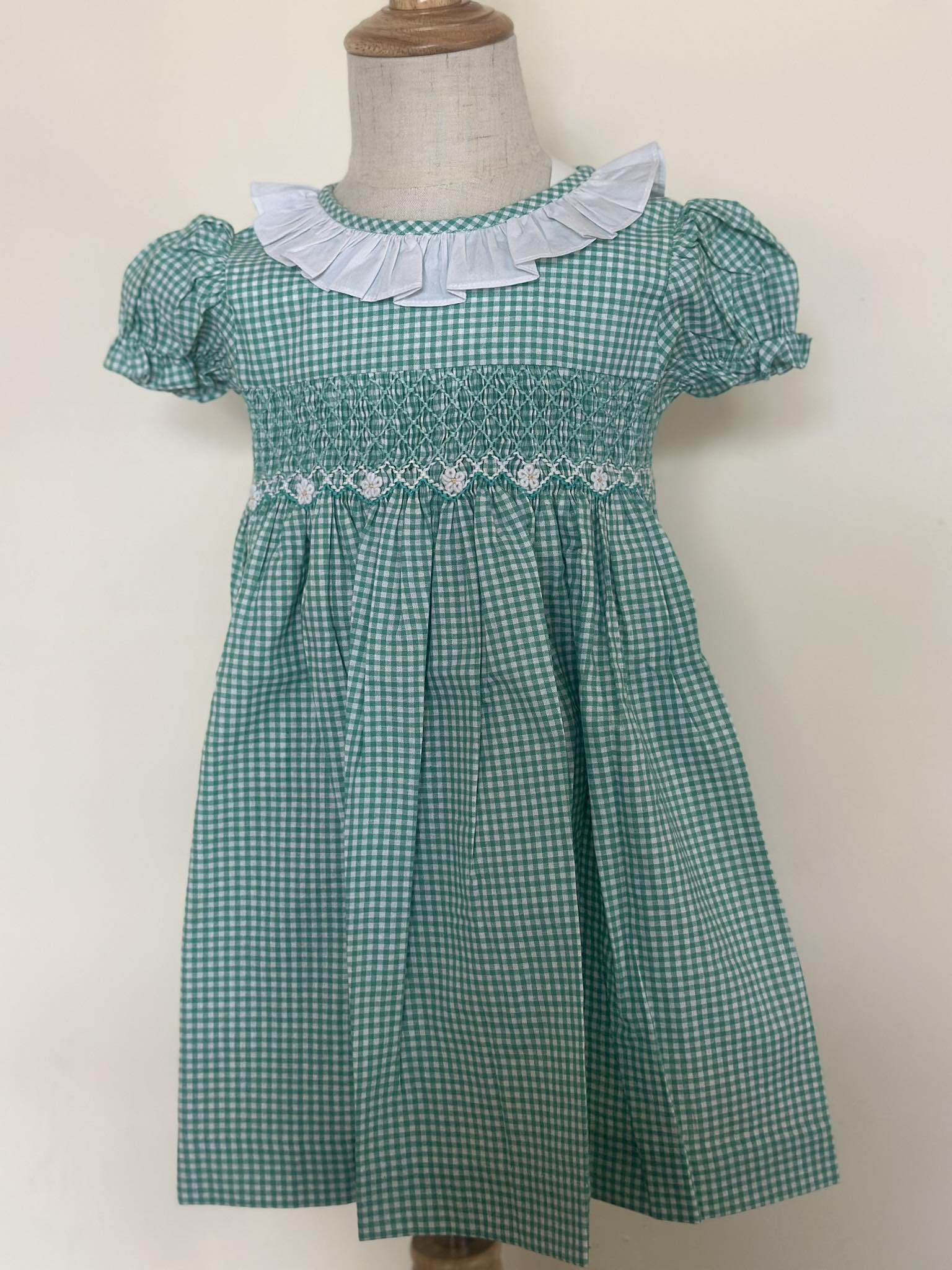 Designed in a fresh turquoise and white gingham pattern, this dress features beautifully detailed hand-smocking across the bodice with tiny embroidered floral accents. The white ruffle collar adds a crisp contrast, while the puff sleeves give it a charming, traditional silhouette.