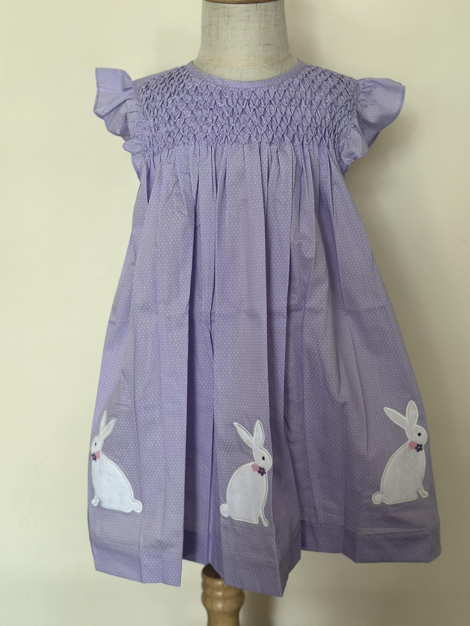 Lavender Smocked Easter Bunny (PS-B361) is a sweet and timeless Easter dress designed especially for toddler girls. Crafted in a soft lavender fabric with subtle white polka dots, this boutique-style dress features a beautifully hand-smocked neckline and delicate flutter sleeves for an elegant finish.
