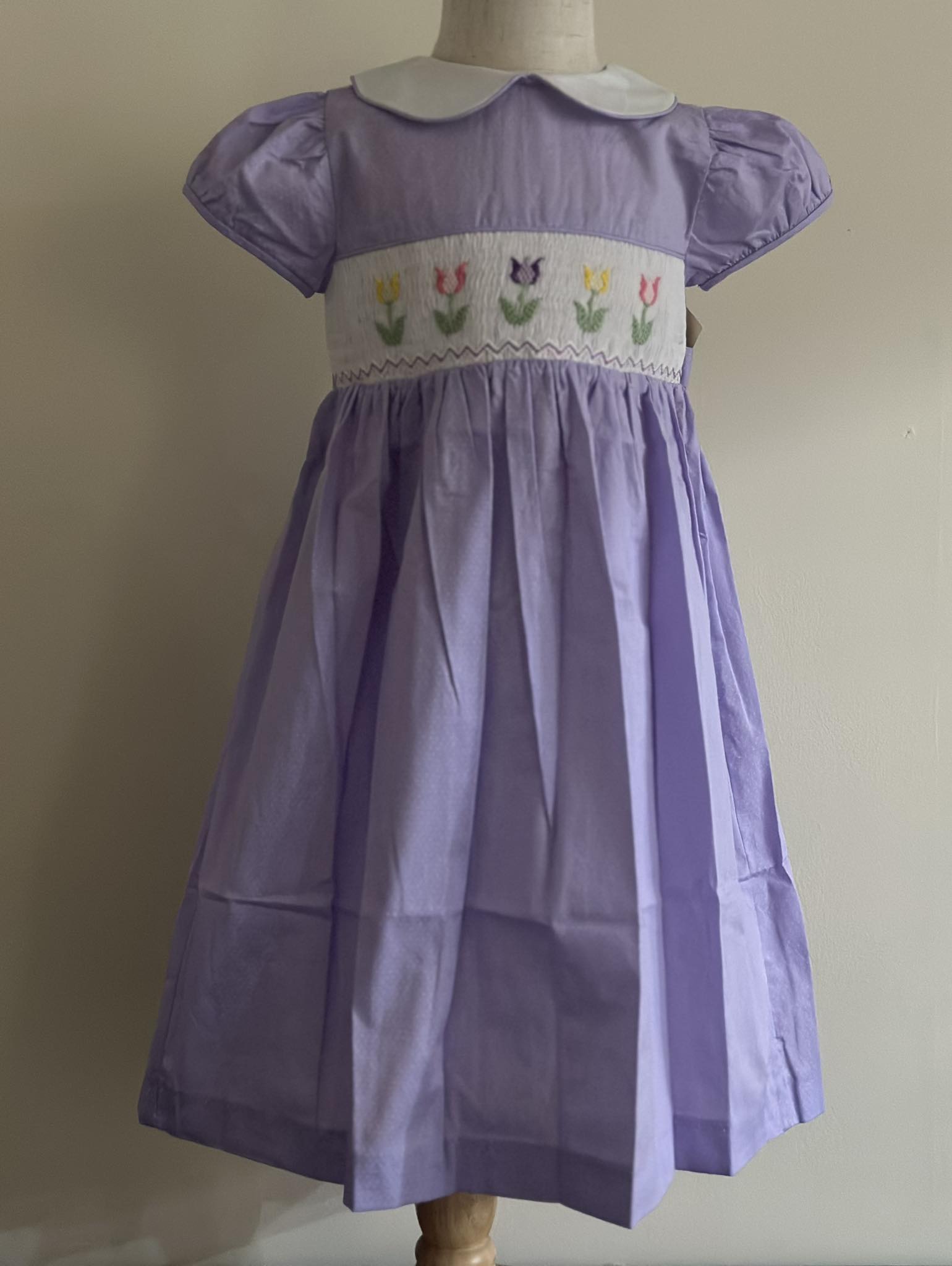 Tulip Smocked Lavender Dress (FK-TM1062) is a beautifully crafted boutique-style dress designed for sweet spring celebrations. Made in a soft lavender cotton fabric, this dress features a hand-smocked bodice adorned with vibrant tulip embroidery and delicate detailing.