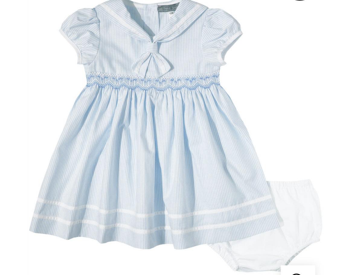 Featuring delicate blue and white vertical stripes, this dress includes a sailor-style collar with front bow detail and hand-smocked stitching across the chest. The puff sleeves and gently gathered skirt create a classic silhouette that feels both polished and playful. Matching white bloomers complete the look for younger sizes.