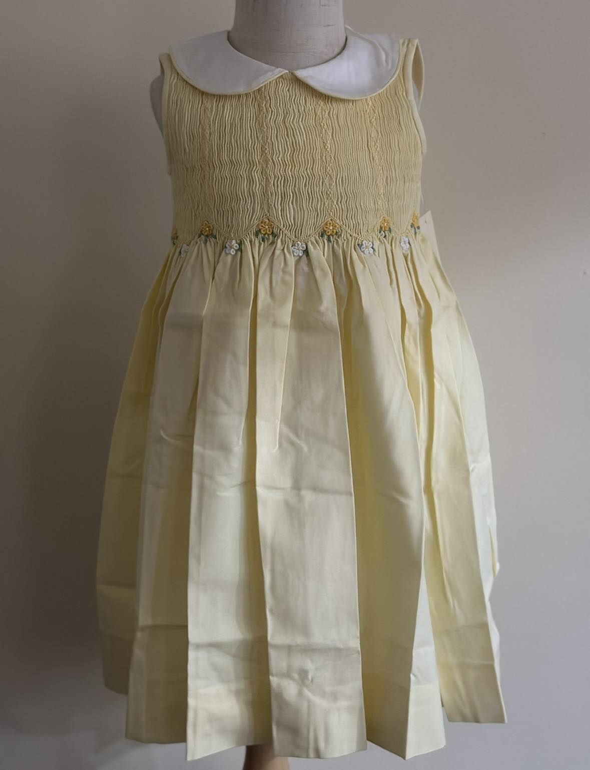 A classic yellow smocked dress with a timeless white Peter Pan collar — sweet, elegant, and perfect for spring celebrations and special occasions.