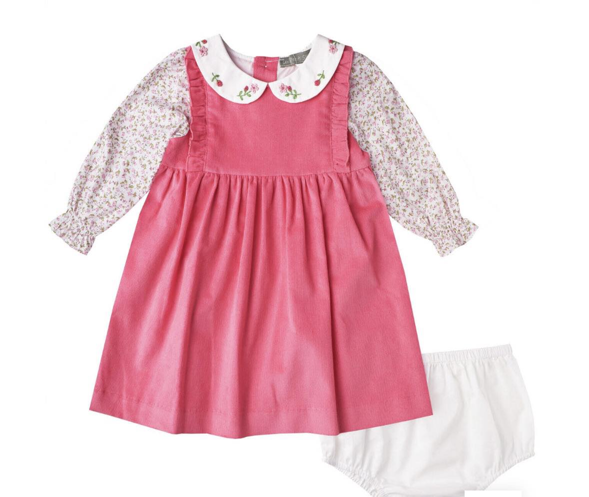 Charming fuchsia pink dress featuring floral embroidered Peter Pan collar, delicate floral sleeves, and matching bloomers — perfect for special occasions and everyday elegance.