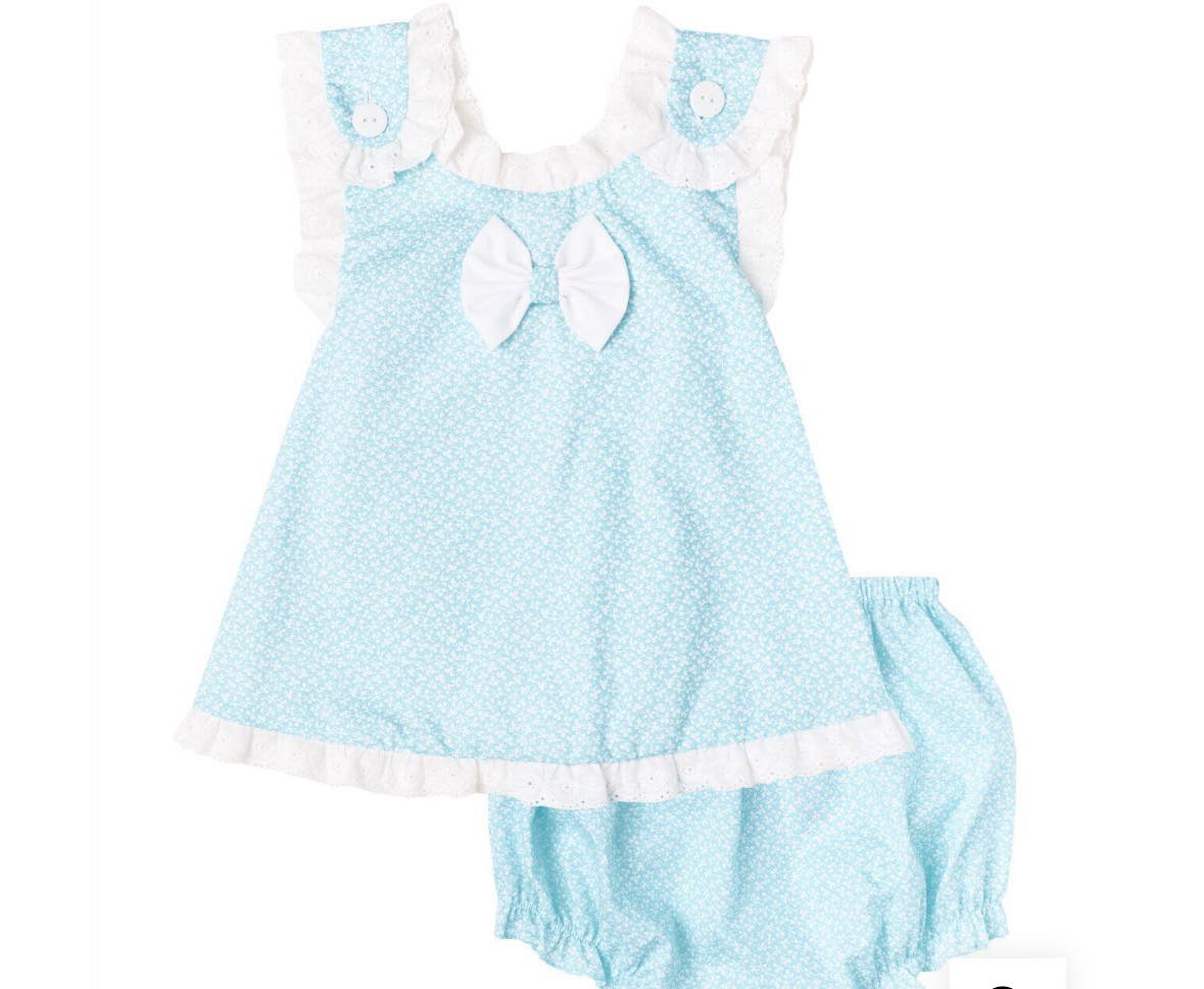 The White Floral Bow Tie Set (PS-B377) is a delightful boutique outfit designed with soft, feminine details. Made from lightweight floral cotton fabric in a refreshing aqua tone, this dress is perfect for spring and summer days.
