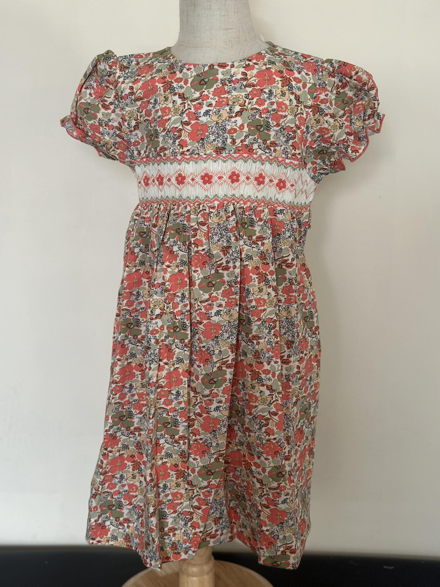 The highlight of this piece is the hand-smocked waist panel, detailed with embroidered floral accents that add texture and craftsmanship. The gently puffed short sleeves and soft gathered skirt create a classic silhouette that flatters little girls of all ages.