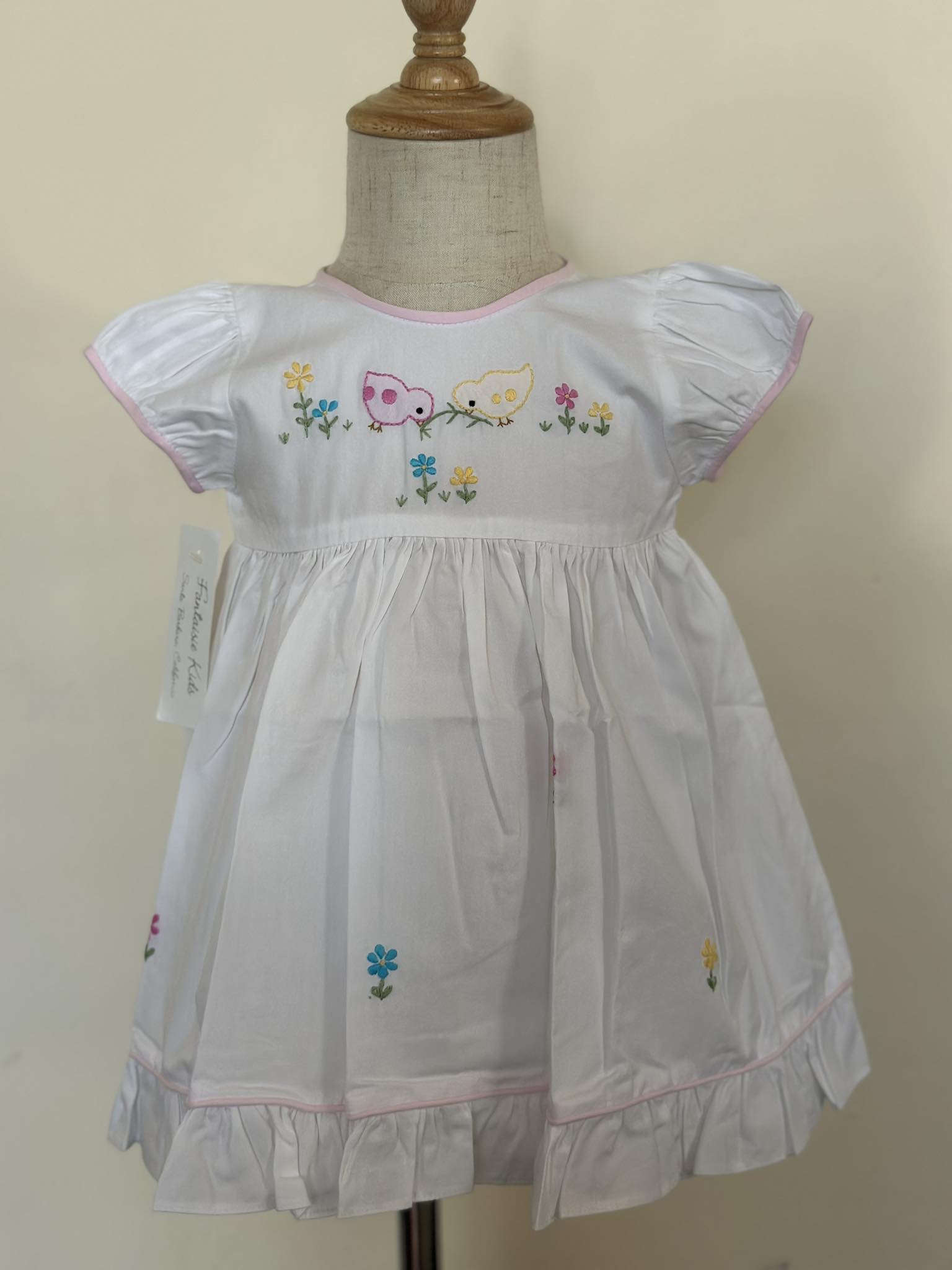 The White Dress 2 Little Ducks (3185) is a delightful boutique dress designed with soft, playful details. Crafted in crisp white fabric, the bodice features two adorable embroidered ducklings surrounded by tiny colorful flowers, creating a cheerful and whimsical look.