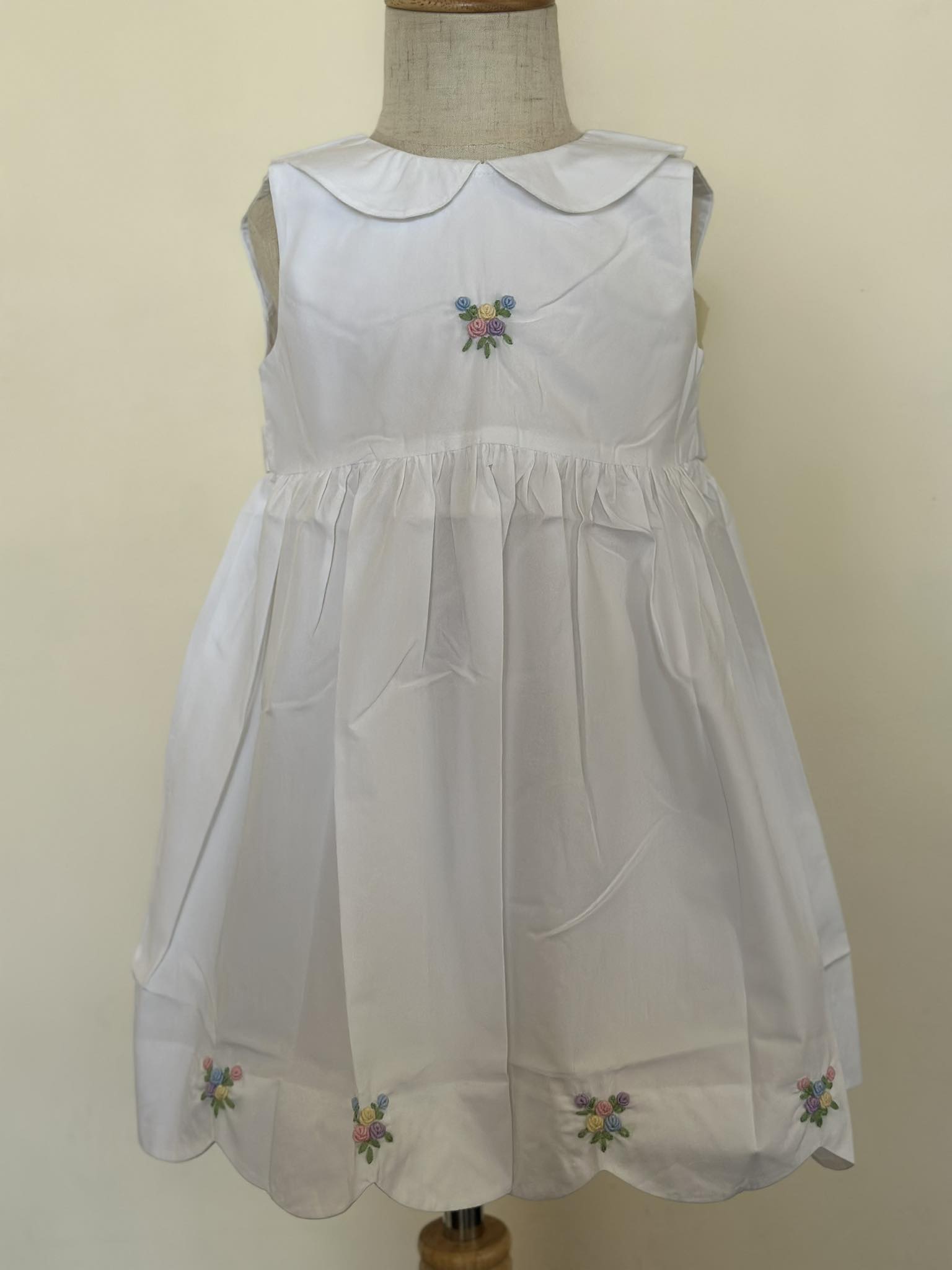 A delicate embroidered floral bouquet on the chest adds a sweet handmade touch, while additional embroidered flowers along the hem create a beautifully balanced design. The classic Peter Pan collar enhances the traditional look, giving the dress a polished and graceful finish.