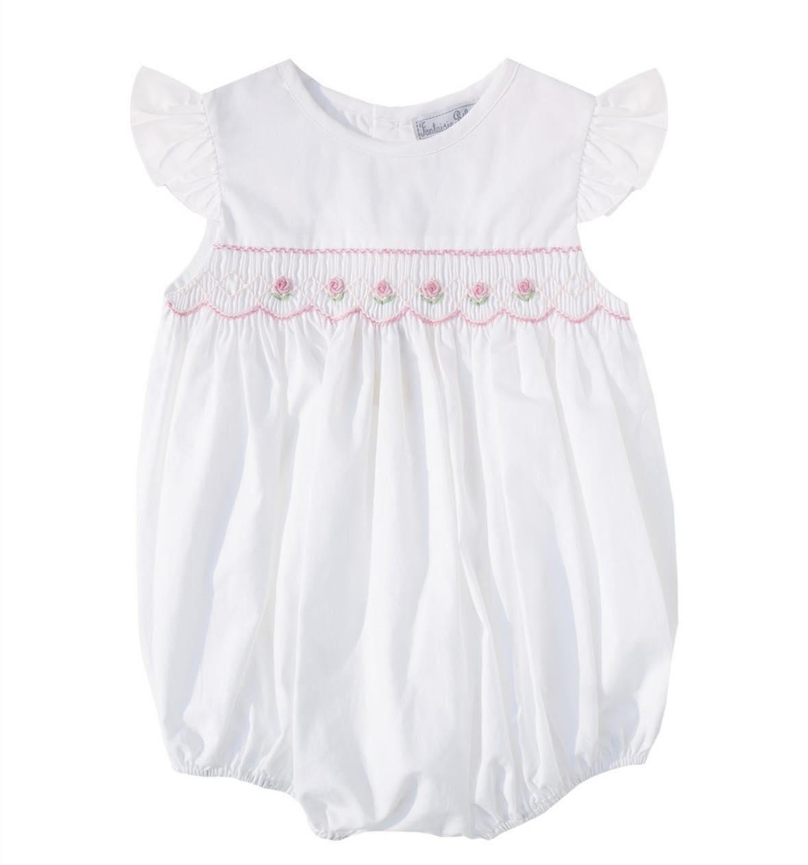 The White & Pink Floral Smocked Bubble (FB-B055) is a timeless boutique bubble designed with soft feminine details. Made from crisp white fabric, this romper features beautiful hand-smocking across the bodice accented with delicate embroidered pink roses and scalloped stitching.